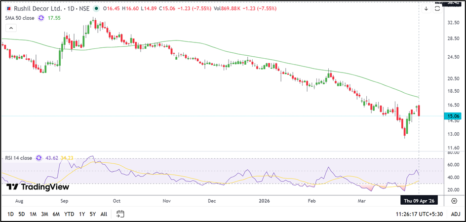 On the upside, Rushil Decor Limited (NSE: RUSHIL) is likely to face resistance between ₹16.10 and ₹17.30. The upper end of this range also remains close to the 50-day moving average, which may continue to act as a hurdle.