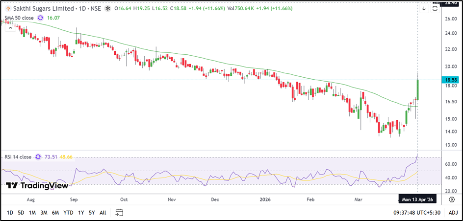 - Sakthi Sugars Limited shares climbed 11.66% to ₹18.58 on April 13, 2026.