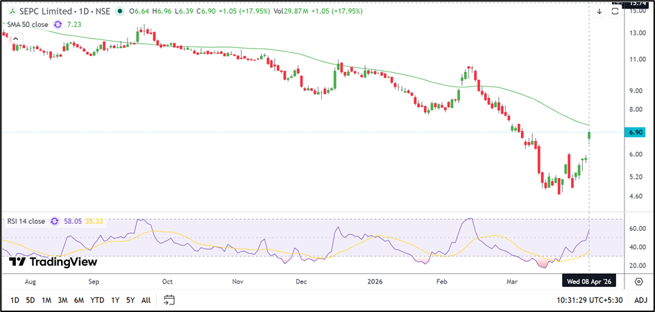 The latest move comes after a steep correction over the past several weeks. SEPC (NSE: SEPC) had fallen toward the INR 5.00 zone before witnessing a strong rebound. The stock is still trading slightly below its 50-day Simple Moving Average near INR 7.23, but the recent rise suggests that selling pressure may be easing.