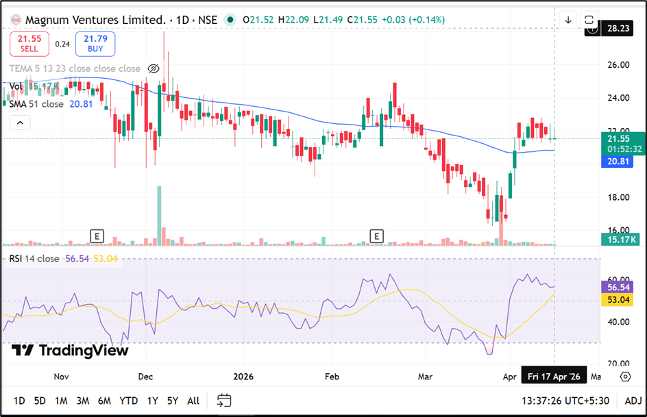 Magnum Ventures Limited is currently trading near its 50-day SMA, reflecting a range-bound trend with gradually improving momentum. While RSI indicates mild strength, the absence of a strong breakout keeps the near-term outlook neutral. Key resistance levels ahead and mixed return profile suggest that price movement may remain within a defined range unless supported by stronger directional cues.