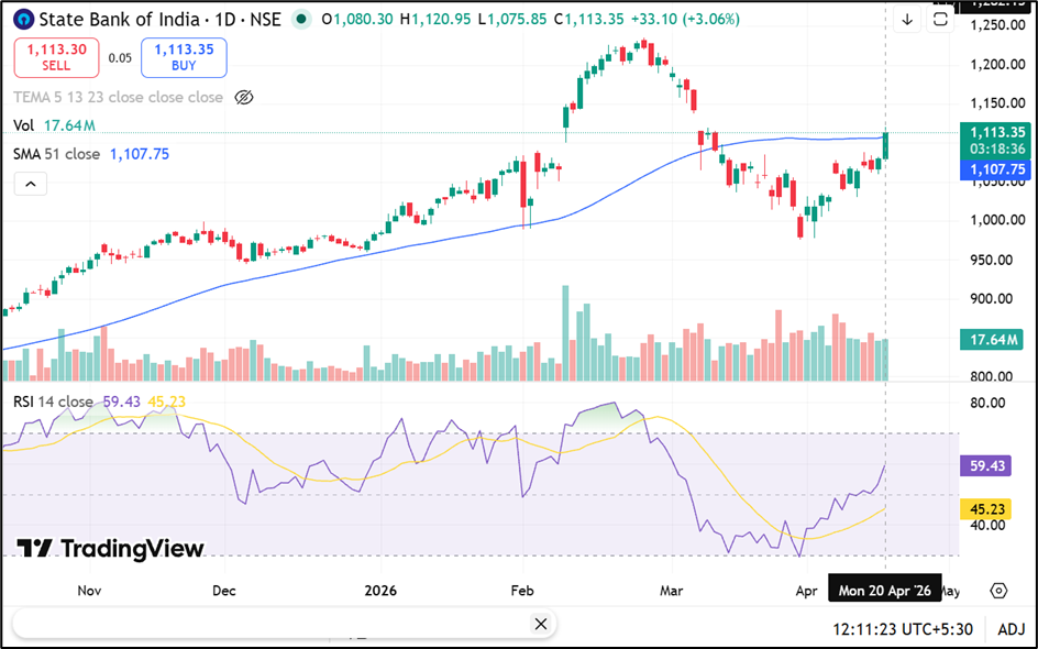 State Bank of India (NSE:SBIN) is trading near ₹1,113.35, up around 3.06% on 20 April 2026, and has reclaimed a position slightly above the 51-day SMA near ₹1,107.75, while the 14-day RSI near 59.43. Immediate support is placed in the ₹1,080.00–1,030.00 zone, while resistance is seen near the ₹1,150.00–1,220.00 range.