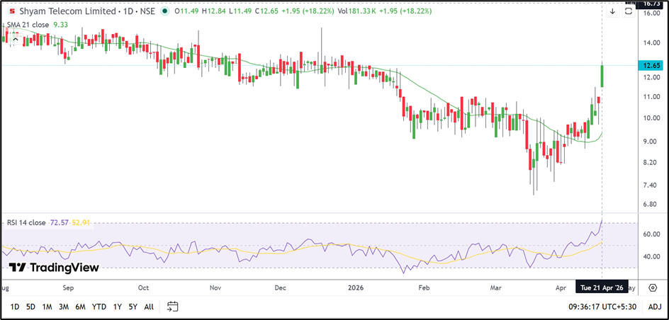 Shyam Telecom Ltd (NSE: SHYAMTEL) has emerged as one of the strongest gainers in the market after a sudden breakout above its earlier trading range. The stock is now trading well above its 21-day SMA and momentum remains firmly positive.