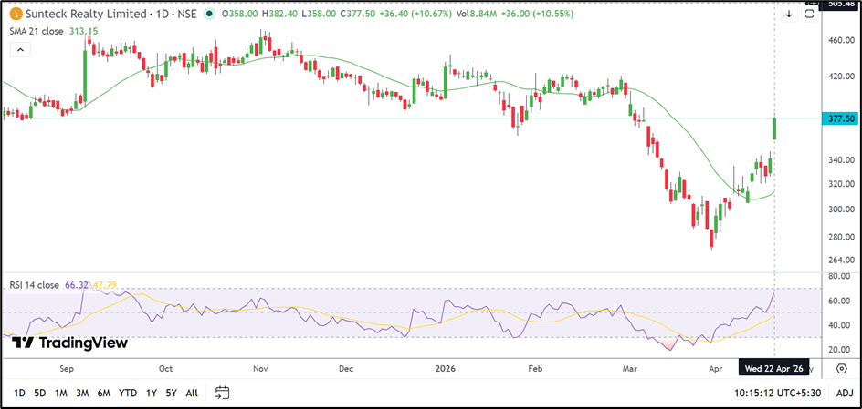 Sunteck Realty Ltd (NSE: SUNTECK) has staged a strong rebound after a weak start to the month. The move above the 21-day SMA and the breakout from the recent range have improved the short-term outlook.