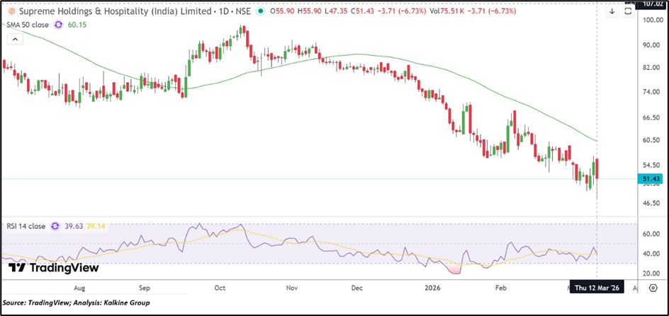 From a technical perspective, Supreme Holdings & Hospitality (India) Limited is trading around ₹51.43 after declining about 6.73% on March 12, 2026. The broader chart structure suggests the stock is undergoing a bearish correction, with prices gradually moving lower over recent months following earlier peaks. The stock is currently trading below its 50-day Simple Moving Average near ₹60.15, which may act as a resistance level if recovery attempts emerge. Meanwhile, the 14-day RSI near 39.63 reflects subdued momentum conditions. In the near term, support may be seen around ₹48–₹45, while ₹55–₹60 could act as the next resistance zone if the stock attempts a recovery.