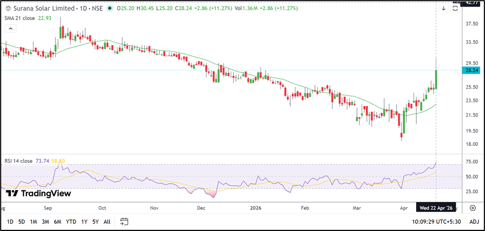 Surana Solar Ltd (NSE: SURANASOL) gained 11.15% to ₹28.21 after opening at ₹25.20 and touching an intraday high of ₹30.45. The stock witnessed a strong breakout after spending several weeks in a narrow trading range.