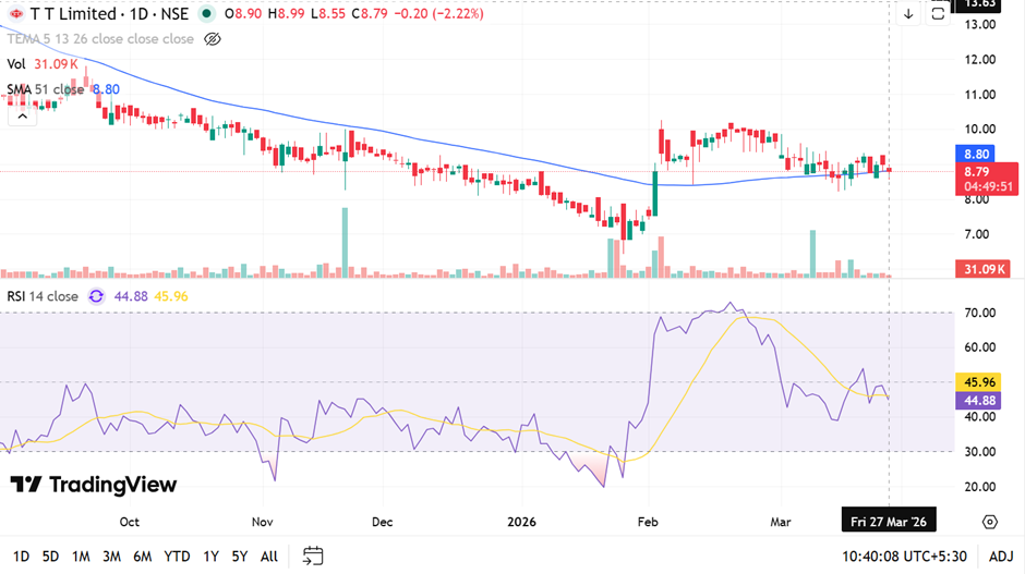 Shares of T T Limited (NSE:TTL) is trading at ₹8.79 on March 27, 2026, falling ₹0.20 or 2.22% on the National Stock Exchange of India. The session reflected mild selling pressure with relatively moderate trading volumes compared to earlier spikes.