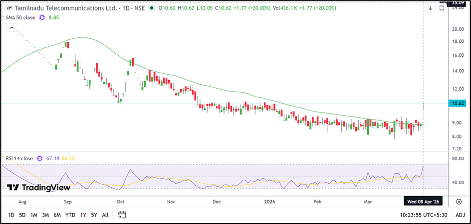Tamilnadu Telecommunication (NSE: TNTELE) has staged a strong technical breakout after hitting a 20% upper circuit and crossing above its 50-day moving average. Momentum has improved, although the company’s fundamentals remain weak. Support is placed near INR 10.00–9.45, while resistance is seen near INR 11.20–12.00.