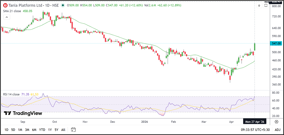 Technically, TANLA is trading near ₹551.10 and has moved decisively above its 21-day SMA around ₹458.05, indicating a strong improvement in short-term structure.