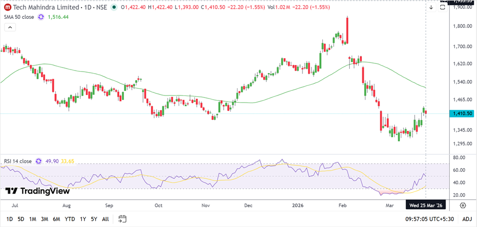 Tech Mahindra Limited is currently trading near ₹1,410.50 as of March 25, 2026, declining around 1.55%, and remains below its 50-day Simple Moving Average near ₹1,516.44, indicating a weak broader setup. The price action shows a sharp decline followed by a rebound from lower levels, with the recent move suggesting a stabilisation phase.