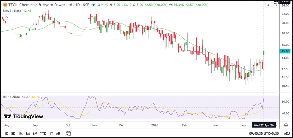 On the upside, the next hurdle may emerge around ₹16.20–17.25. A move above ₹16.20 could allow TECIL Chemicals and Hydro Power to extend the current rally.