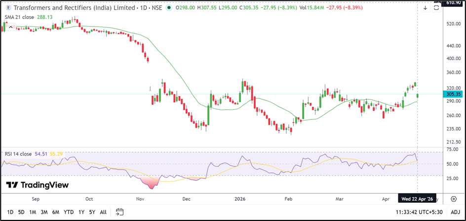 Transformers & Rectifiers remains supported by healthy industry demand and a strong execution pipeline, but the March-quarter results indicate that profitability is not improving as quickly as revenue. The stock continues to trade above its 21-day SMA, though resistance near ₹330 remains a hurdle. Unless the stock reclaims that band, the recent rebound may pause and shift into a sideways range.
