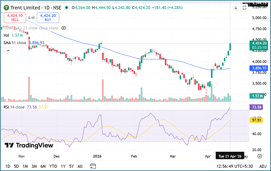 Trent Limited (NSE:TRENT) is trading near ₹4,424.20, up around 4.28% as on 21 April 2026, and continues to remain above the 51-day SMA near ₹3,856.93, while the 14-day RSI near 73.58 points. Immediate support is placed in the ₹4,000.00–3,850.00 zone, while resistance is seen near the ₹4,500.00–4,750.00 range.