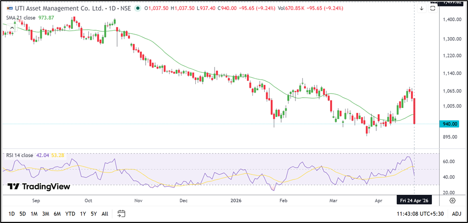 Technically, UTIAMC has witnessed a sharp rejection after attempting a recovery, forming a strong bearish candle on the daily chart. The stock has now slipped below its 21-day SMA near ₹973.87, indicating weakening short-term structure.