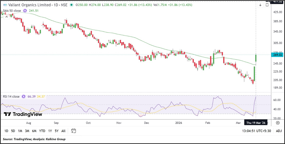 Valiant Organics Limited (NSE:VALIANTORG) is currently trading around ₹269.02, gaining about 13.43%, and has moved above its 50-day Simple Moving Average near ₹241.51, which now acts as a key near-term technical reference. The price structure reflects a strong pullback recovery from recent lows, with two consecutive bullish sessions indicating sustained strength and improved participation.