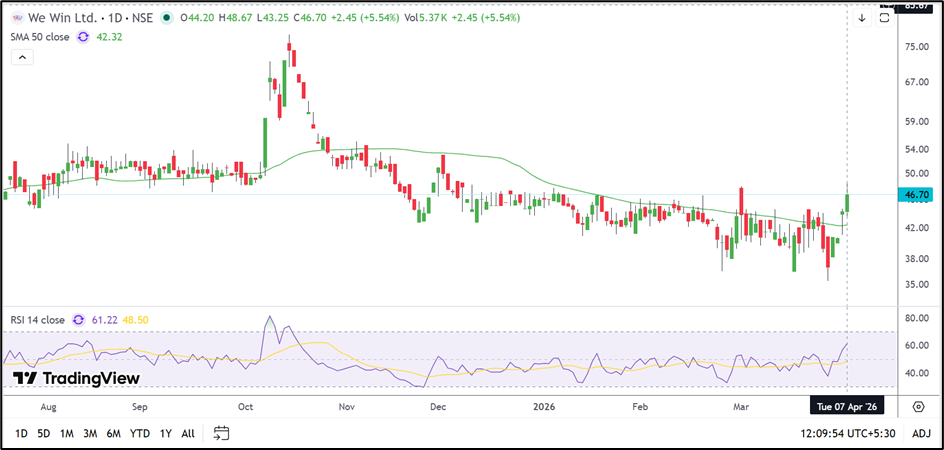 We Win (NSE: WEWIN) has shown fresh strength after rising 5.54% to INR 46.70 and moving back above its 50-day moving average. Momentum indicators have improved, although the stock is now nearing an important resistance zone. Support is placed near INR 42.00–38.00, while resistance remains near INR 51.00–55.00.