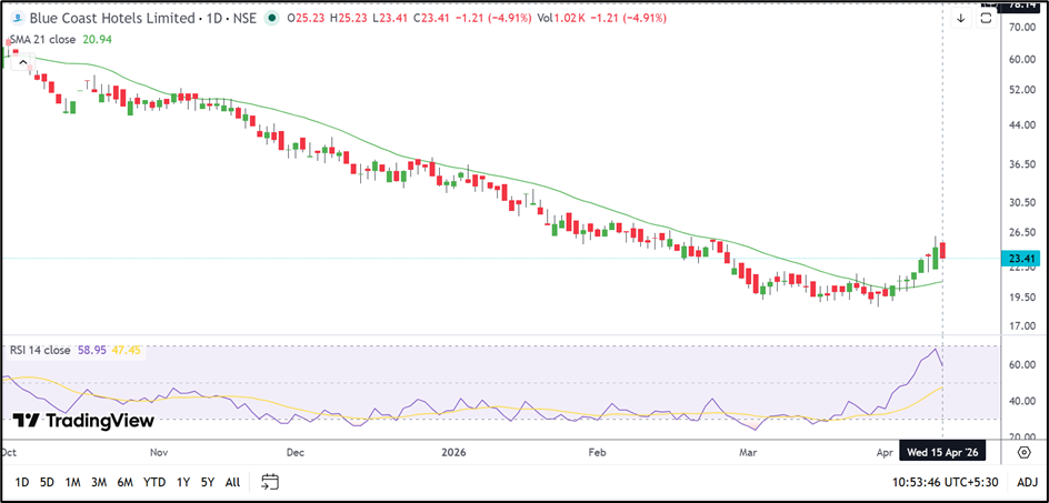 Blue Coast Hotels is trading near ₹23.41, down around 4.91%, but maintains its position above the 21-day SMA near ₹20.94, indicating a nascent recovery phase. The recent breakout from a long-term downtrend suggests shifting sentiment, supported by an RSI near 58.95, showing positive momentum. Immediate support is seen in the ₹19.50–21.00 zone, while resistance is anticipated near the ₹27.00–30.00 range.