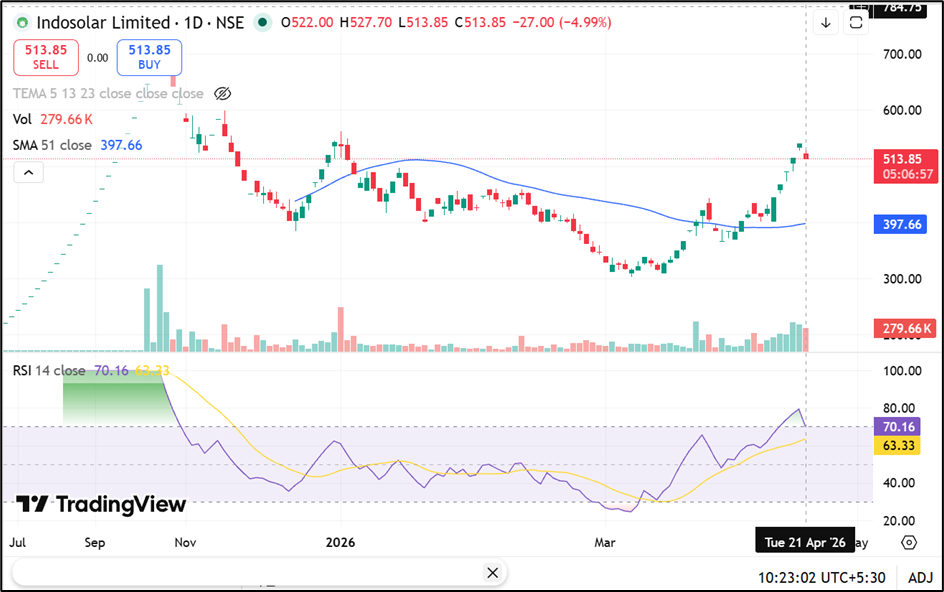 Indosolar Limited (NSE:WAAREEINDO) is trading near ₹513.85, down around 4.99%, and continues to remain above the 51-day SMA near ₹397.66, while the 14-day RSI near 70.16 points. Immediate support is placed in the ₹450.00–400.00 zone, while resistance is seen near the ₹550.00–600.00 range.