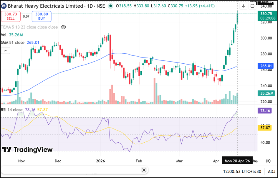 Bharat Heavy Electricals Limited (NSE:BHEL) is trading near ₹330.75, up around 4.41% on 20 April 2026, and has surged significantly above the 51-day SMA near ₹265.01, while the 14-day RSI near 78.16 points. Immediate support is placed in the ₹280.00–260.00 zone, while resistance is seen near the ₹345.00–360.00 range.