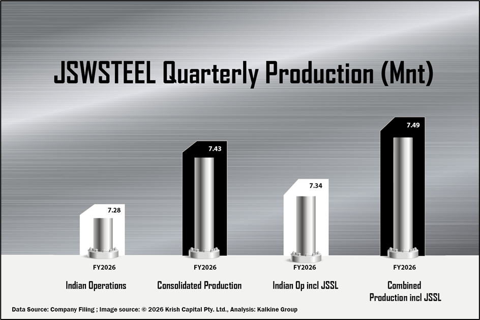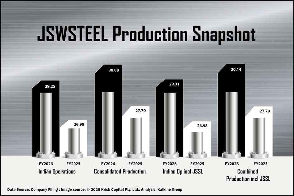 JSW Steel Limited reported FY26 combined crude steel production of 30.14 million tonnes, reflecting 8% YoY growth. Capacity expansion at Salem supported output, while the BF-3 shutdown at Vijayanagar impacted utilisation. Quarterly production remained stable, and restructuring involving JSW Sambalpur Steel added incremental volumes to overall combined production figures.