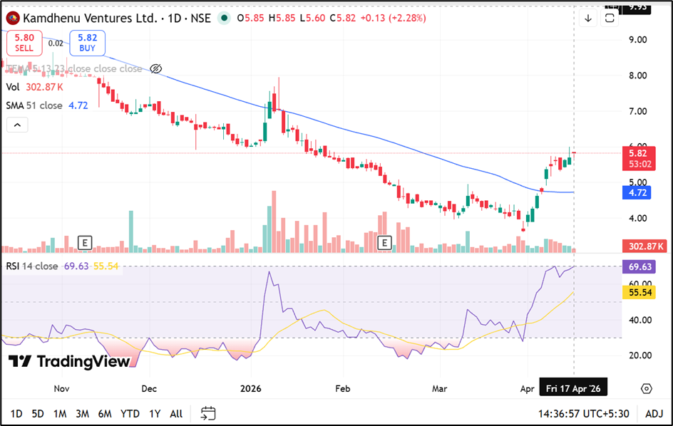 Kamdhenu Ventures Ltd. is trading near ₹5.82, up around 2.28%, and has moved above the 50-day SMA near ₹4.72, with the 14-day RSI near 69.63 points to strengthening momentum, just below overbought territory. Immediate support is placed in the ₹5.00–4.60 zone, while resistance is seen near the ₹6.20–6.80 range.