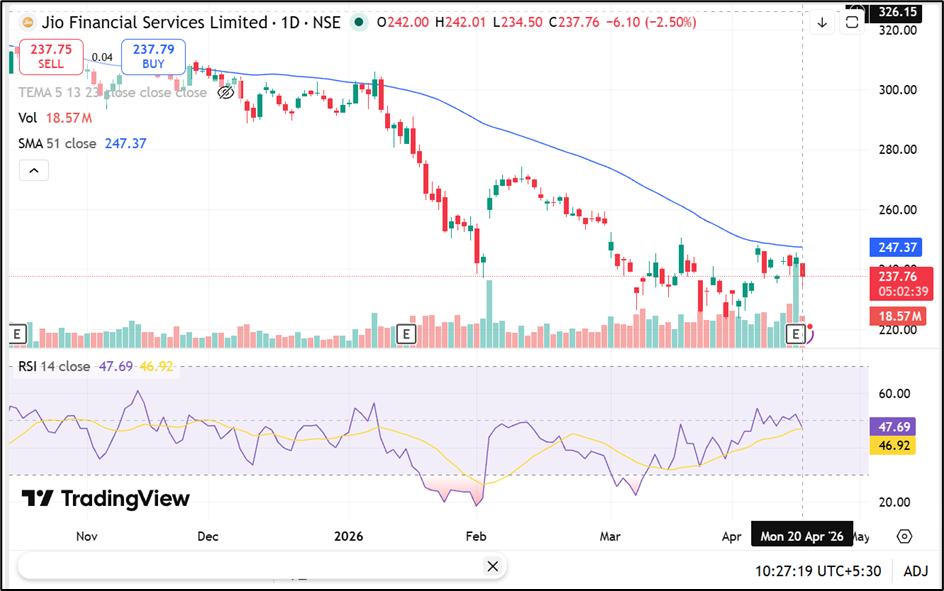 Jio Financial Services Limited (NSE:JIOFIN) is trading near ₹237.76, down around 2.50% on 20 April 2026, and continues to trade below the 51-day SMA near ₹247.37, while the 14-day RSI near 47.69 with immediate support is placed in the ₹220.00–210.00 zone, while resistance is seen near the ₹260.00–280.00 range.
