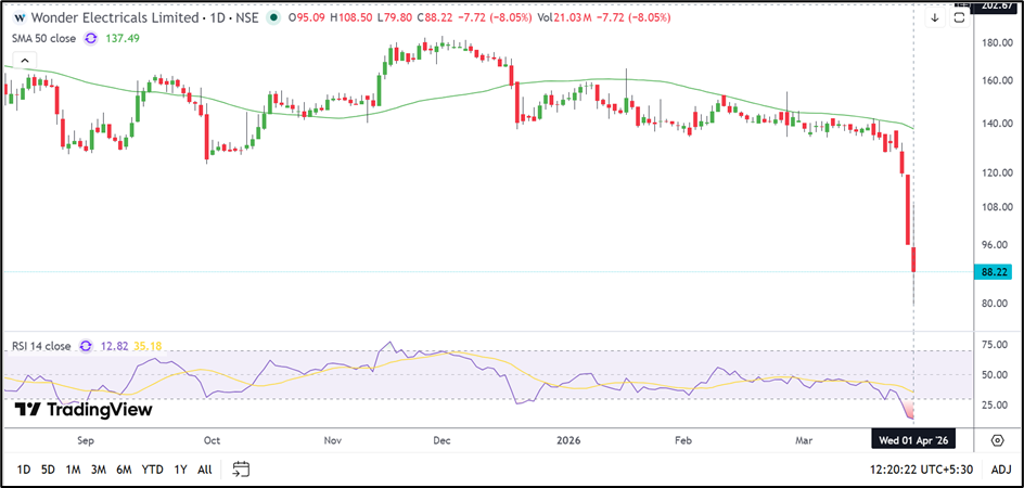 Wonder Electricals is currently trading near INR 88.22 and remains well below its 50-day Simple Moving Average near INR 137.49. The latest price action suggests that the stock has entered a deeper correction phase after breaking below the INR 95.00 level.