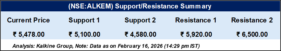 Alkem Labs Ltd (NSE:ALKEM) is trading at ₹5,478. Key support levels are at ₹5,100 and ₹4,580, while resistance levels are at ₹5,920 and ₹6,500. The stock is currently positioned between these support and resistance points, showing the range of recent price activity. These levels serve as reference points for tracking price movements.