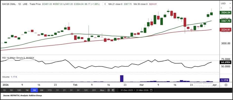 From a technical perspective, LME Aluminium (May 2026 contract) is trading near USD 3,504 per metric ton, up around 1.98%, and remains above its 21-day SMA at USD 3,367.70 and 50-day SMA at USD 3,224.81, highlighting a firm broader trend. The chart continues to show higher highs and higher lows, with prices rebounding strongly after testing the 50-day SMA in March. Aluminium is now moving close to the recent four-year peak near USD 3,567. Meanwhile, the 14-day RSI near 64.69 suggests momentum remains positive, though it is approaching overbought territory. Near-term support is placed at USD 3,250.00–USD 3,100.00, while resistance stands at USD 3,700.00–USD 4,000.00.