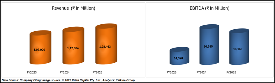 In FY25, Amara Raja Energy & Mobility reported consolidated revenue of ₹12,846.3 crore, reflecting a 9.7% year-on-year increase from ₹11,708.4 crore in FY24. Profit after tax (PAT) rose slightly by 1.1% to ₹944.7 crore, while diluted EPS edged up to ₹51.62 from ₹51.05 in the previous year.