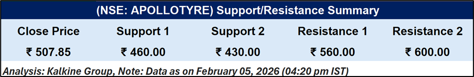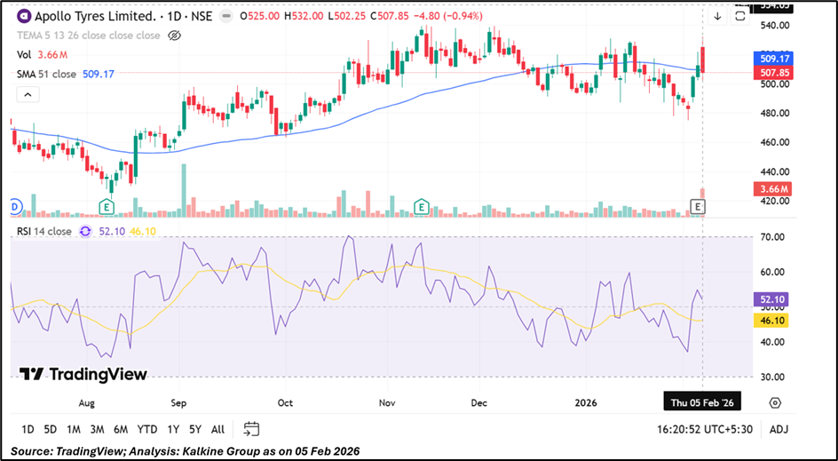 Apollo Tyres’ Q3 FY26 results highlight strong revenue growth, robust profitability, and balanced contributions from domestic and European markets. Record domestic performance, efficient operations, and diversified product mix underscore the company’s resilience and market leadership. Technical indicators show neutral momentum with potential upside near ₹560–₹600, supported around ₹460–₹430. With strategic international presence and continued demand momentum, Apollo Tyres is well-positioned for sustained growth and long-term value creation for shareholders.
