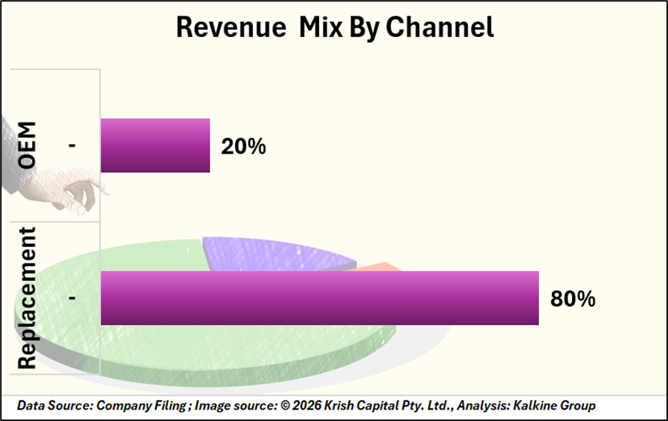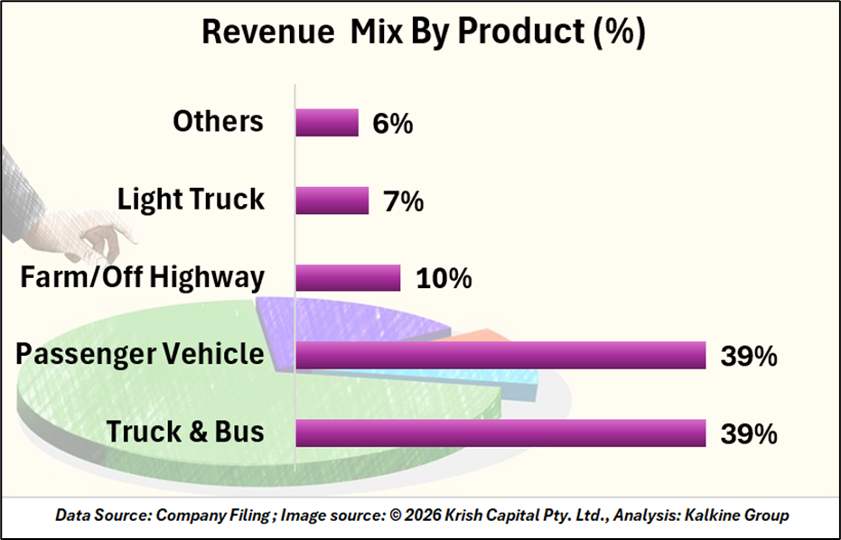 By product, truck and bus tyres and passenger vehicle tyres each contributed 39% to total revenue, while farm/off-highway tyres, light truck tyres, and others accounted for 10%, 7%, and 6%, respectively.