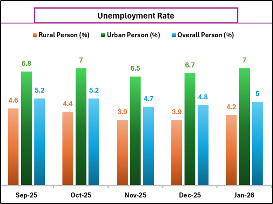 The Unemployment Rate (UR) rose modestly to 5.0% in January 2026 from 4.8% in December. Rural UR increased from 3.9% to 4.2%, while urban UR moved up from 6.7% to 7.0%.