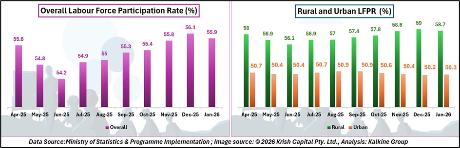 The overall Labour Force Participation Rate (LFPR) for persons aged 15 years and above stood at 55.9% in January 2026, slightly lower than 56.1% in December 2025. Rural LFPR eased from 59.0% to 58.7%, while urban LFPR edged up marginally from 50.2% to 50.3%.