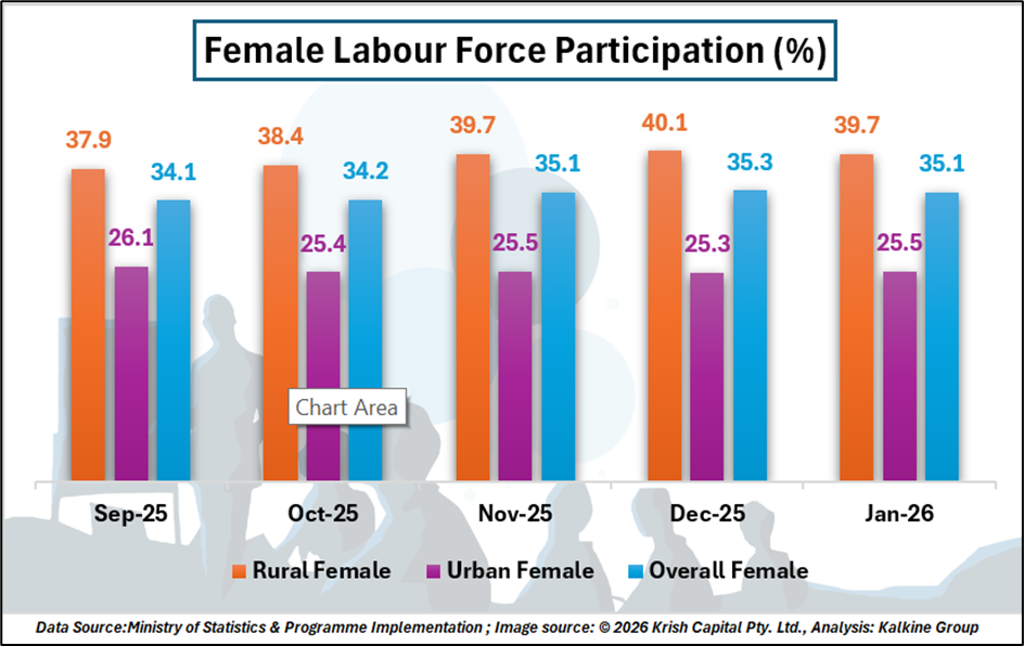 Female labour force participation continued to show stability. The overall Female LFPR was recorded at 35.1% in January 2026, unchanged from November 2025 levels. Rural female LFPR stood at 39.7%, while urban female LFPR reached 25.5%.