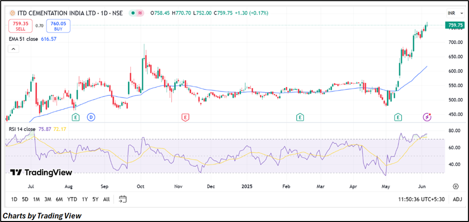ITD Cementation India Ltd (NSE: ITDCEM) has been in a strong uptrend since May 2025, following a breakout from a prolonged consolidation phase. The stock is currently trading well above its 51-period EMA (₹616.57), highlighting sustained bullish momentum. The 14-period RSI stands at 72.17, indicating overbought territory, which could lead to a short-term pullback or sideways movement. However, there are no immediate signs of bearish divergence, and the RSI continues to support the current price strength. Investors and traders should keep an eye on any potential loss of momentum or a breach of the EMA as key signals.