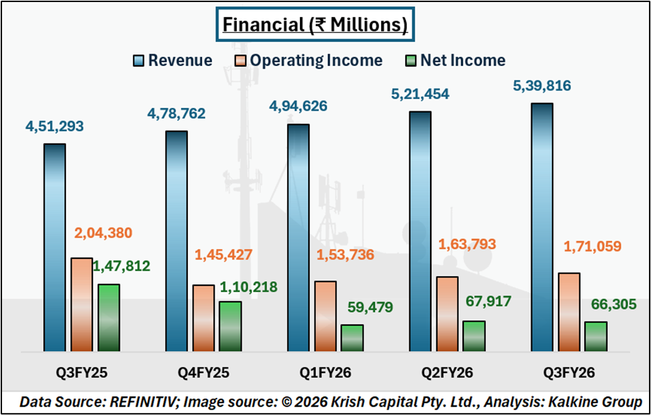 Bharti Airtel’s consolidated financials over the past five quarters show steady revenue growth, with Q3FY26 revenue reaching ₹5,39,816 crore. Operating income increased to ₹1,71,059 crore in the same quarter, while net income stood at ₹66,305 crore.