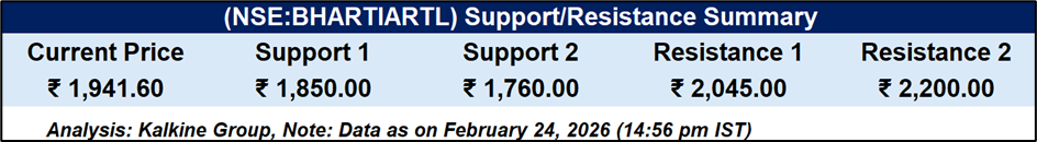 Bharti Airtel traded at ₹1,941.60. The stock finds immediate support at ₹1,850, with a secondary support level at ₹1,760. On the upside, resistance is seen at ₹2,045, followed by a stronger resistance at ₹2,200. Price movement around these levels will be crucial in determining near-term trends, with breaks of support or resistance likely guiding the next directional move.