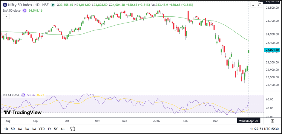 From a technical perspective, The NIFTY 50 is trading near 24,004.30, up 3.81%, after rebounding sharply from recent lows around 22,000. The index has reclaimed the 24,000 marks, but it remains below its 50-day Simple Moving Average near 24,548.16, indicating that the broader structure remains weak. The 14-day RSI has improved to 53.96, showing that short-term momentum has recovered from oversold conditions. On the downside, the 23,300–23,500 zone may provide immediate support if the rally fades. On the upside, the 24,500–24,550 range remains the key hurdle for any further recovery.