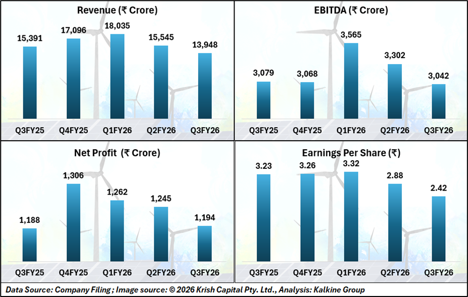In Q3 FY26, Tata Power reported a Profit After Tax (PAT) of ₹1,194 crore, marginally up from ₹1,188 crore in the same quarter last year. Consolidated Revenue from Operations for the quarter stood at ₹13,948.41 crore, while EBITDA rose 12% year-on-year to ₹3,042 crore, supported by operational efficiencies and stronger contributions from the renewable energy and distribution businesses.