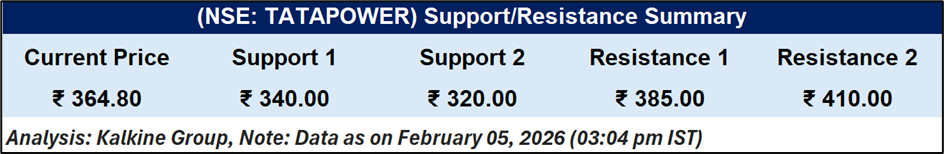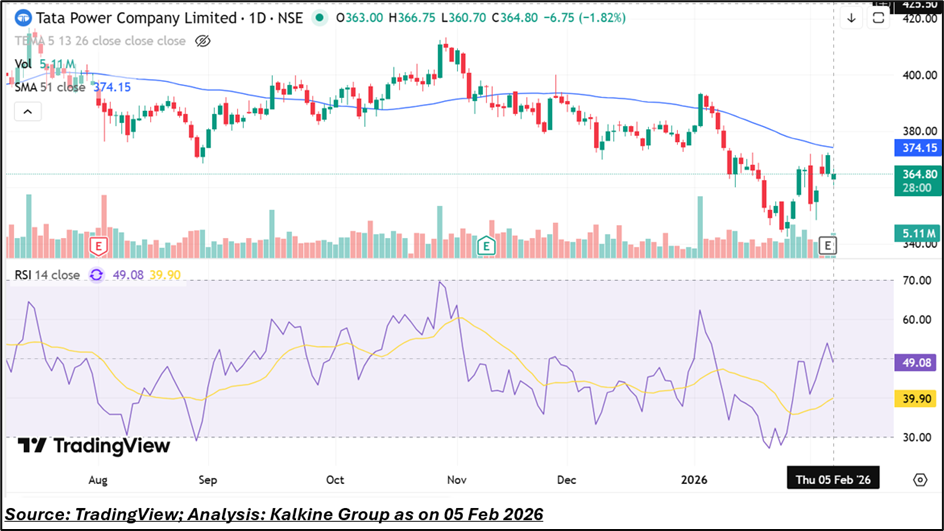Tata Power traded at ₹364.80, below its 51-day simple moving average (SMA) of ₹374.15. The stock recently rose from around ₹340, with the next support level near ₹320. Resistance levels are at ₹385 and ₹410. The Relative Strength Index (RSI) is 49.08. Daily trading volumes have been moderate, with occasional increases during earnings announcements.