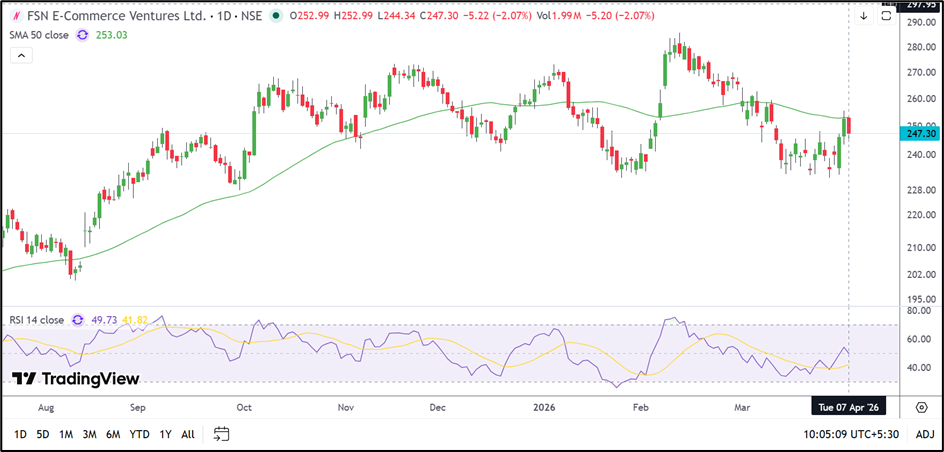 FSN E-Commerce Ventures Limited (NSE: NYKAA) is currently trading near INR 247.30 and remains close to its 50-day Simple Moving Average near INR 253.03. The chart suggests that the stock is moving within a broad range after failing to sustain above the INR 280.00 area earlier.