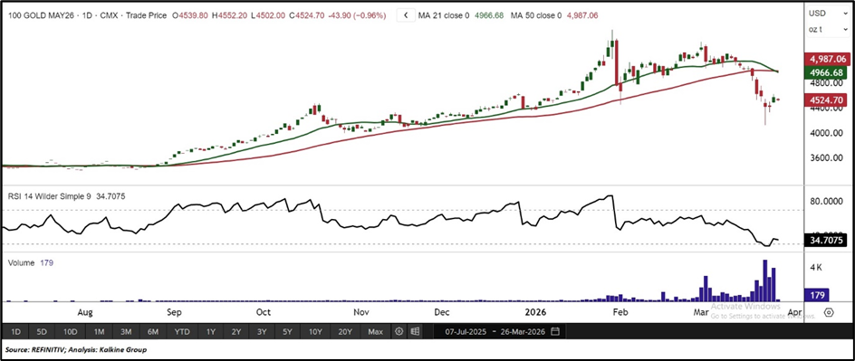 From a technical perspective, Gold (COMEX) is currently trading near USD 4,524.70, declining around 0.96%, and remains below its 21-day Simple Moving Average USD 4966.66 and 50-day Simple Moving Average USD 4,987.06, reflecting a weak broader price structure. The chart shows a sequence of lower highs and lower lows, indicating an ongoing corrective phase. However, a mild rebound from recent lows suggests early signs of stabilisation. The 14-day RSI near 34.70 indicates recovery from oversold territory, pointing to gradually improving momentum. In the near term, support is seen around USD 4,200.00–USD 4,000.00, while resistance is placed near USD 4,800.00–USD 5,000.00.