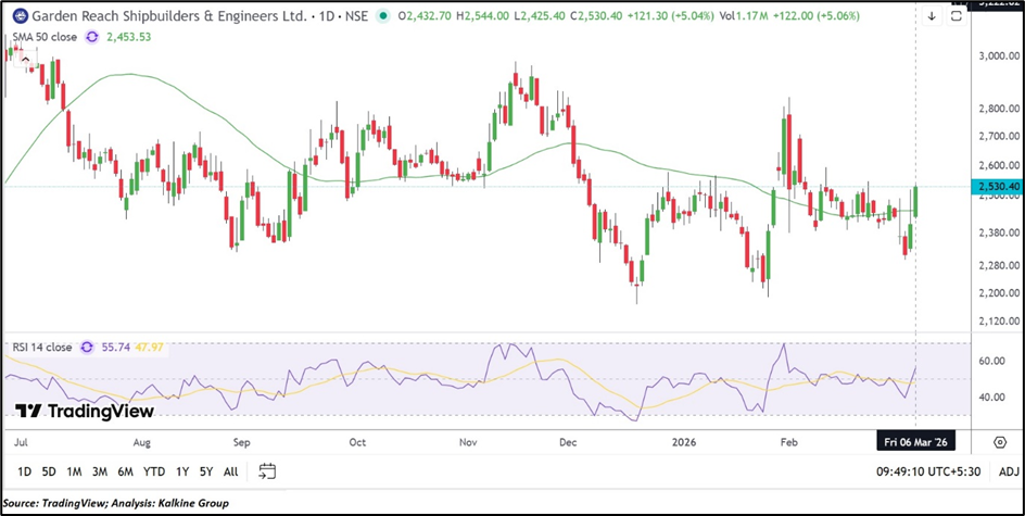 From a technical perspective, Garden Reach Shipbuilders & Engineers Ltd (NSE: GRSE) is showing signs of short-term recovery after rebounding from recent lows, with the stock currently trading near ₹2,530.40. The price is moving around its 50-day simple moving average at ₹2,453.53, indicating improving momentum. The recent bounce suggests renewed buying interest following a consolidation phase. Meanwhile, the 14-period RSI at 55.74 reflects moderate bullish momentum without entering overbought territory. If the stock sustains above the moving average zone, it could attempt a move toward ₹2,800.00–₹3,200.00, while ₹2,200.00–₹2,000.00 may provide immediate downside cushioning.