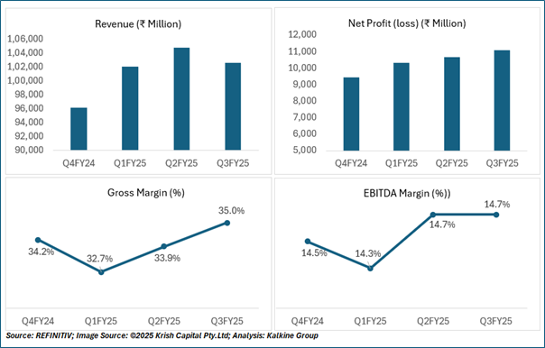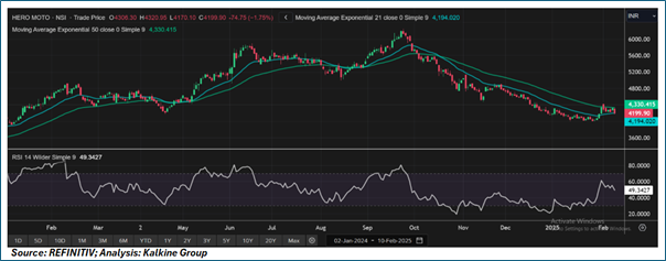 Hero MotoCorp’s EBITDA for Q3FY25 grew 8% to ₹1,476 crore, reflecting improved operational efficiency and cost management. The company’s PAT rose 12% to ₹1,203 crore, driven by higher revenues and effective cost control, highlighting its strong financial health.