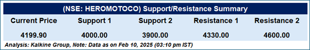 Key support levels are at ₹4,100 – ₹4,150, coinciding with recent lows and the 21 EMA, with stronger support around ₹3,900 – ₹4,000. On the upside, immediate resistance is at ₹4,330 – ₹4,350, near the 50 EMA, with a major hurdle at ₹4,600 – ₹4,700. A breakout above ₹4,330 could signal a trend reversal, while failing to hold ₹4,100 may push the stock toward ₹3,900. Traders should monitor these levels closely.