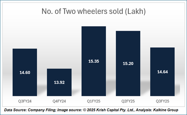 In Q3FY25, Hero MotoCorp sold 14.64 lakh units of two-wheelers, a slight increase from the 14.60 lakh units sold in Q3FY24. This growth, although modest, highlights the company’s ability to maintain steady sales despite a competitive and dynamic market environment. The company’s diversified product portfolio, which includes motorcycles, scooters, and electric vehicles (EVs), has enabled Hero MotoCorp to cater to a wide customer base, ensuring resilience in fluctuating market conditions.