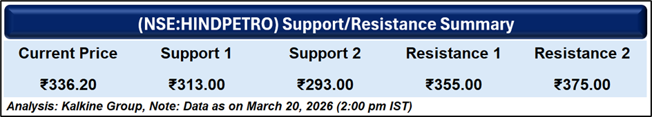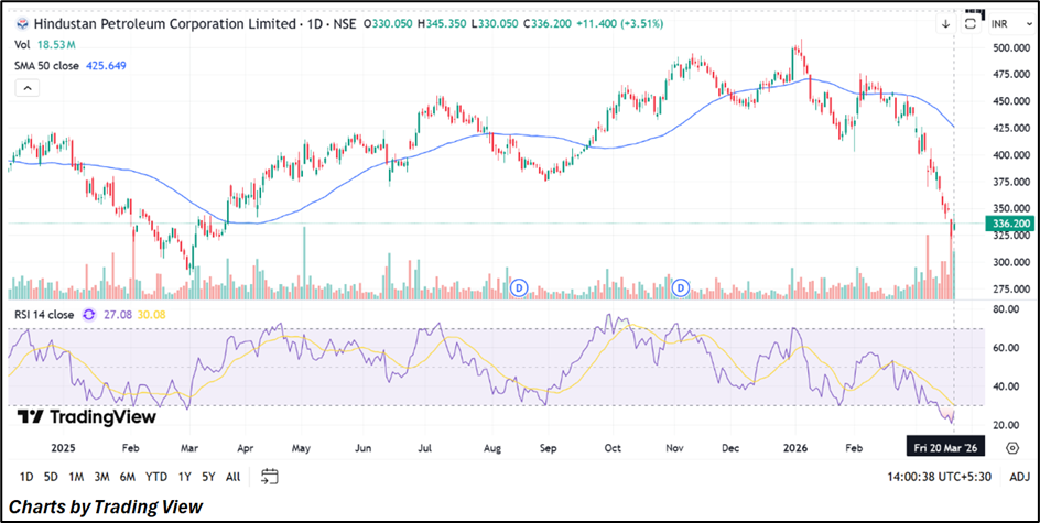 HPCL shares rebounded nearly 5% to ₹341 in the latest session as crude prices cooled slightly following efforts to stabilise supply routes. However, the recovery follows a sharp correction, with the stock declining nearly 22% in March significantly underperforming broader indices.