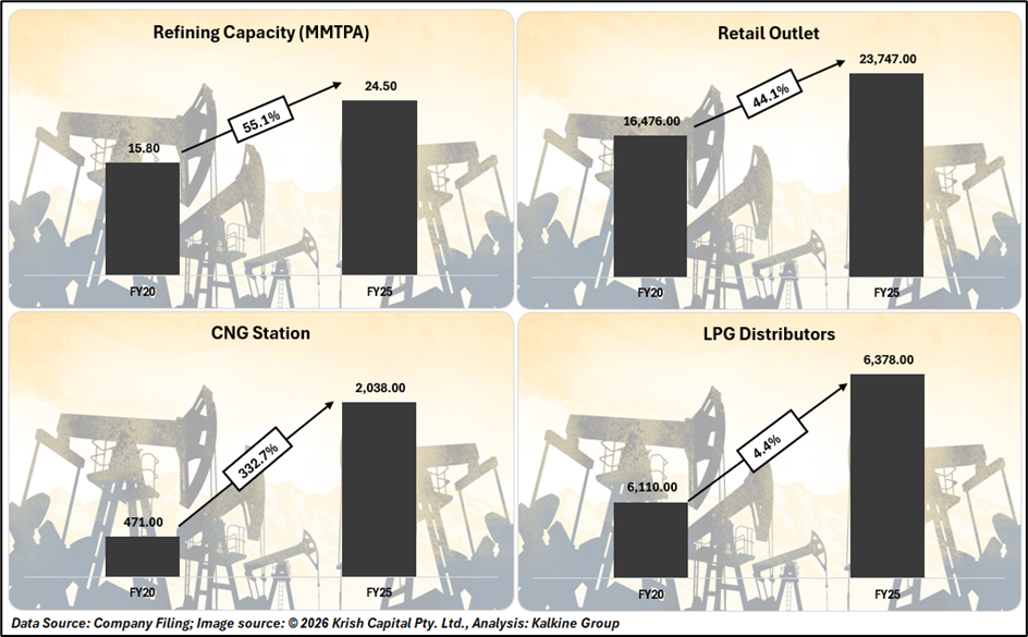 Despite strong volumes, profitability has come under pressure. FY25 revenue stood at ₹4.66 lakh crore, while net profit declined sharply to ₹7,365 crore due to a fall in gross refining margins (GRM), which dropped to $5.74 per barrel from $9.08 in the previous year.