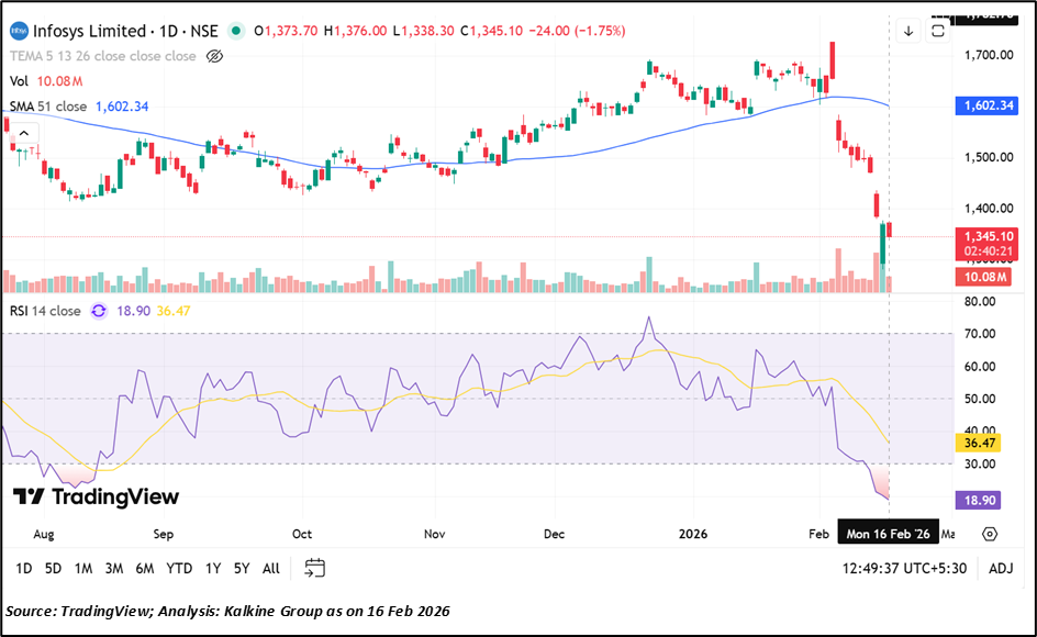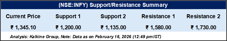 As of February 16, 2026, Infosys is trading at ₹1,345.10. Key support levels are at ₹1,200 and ₹1,135, while resistance levels are at ₹1,580 and ₹1,730. The stock is currently positioned between these support and resistance points, reflecting the range of recent trading activity. These levels provide reference points for monitoring price movements.