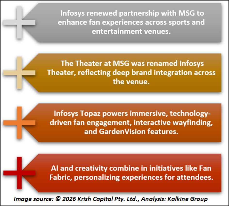 As part of this collaboration, the Theater at MSG has been renamed the Infosys Theater at Madison Square Garden, and the Infosys Suite Level now features branded integration across 18 suites. Leveraging Infosys Topaz, the company enhances fan engagement through immersive technology-driven experiences, in-arena signage, GardenVision features, and interactive wayfinding.